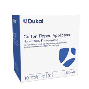 Non-Sterile Cotton Tipped, Disposable, Wood Dowels, 100 per Bag. 10 Bags per Box. Two Sizes Available in 3″ or 6″. Dukal #9006